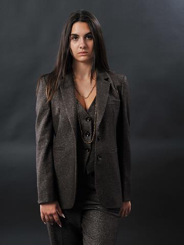 Giacca due bottoni, tasca filetto. Effetto brillante grazie al lurex.
